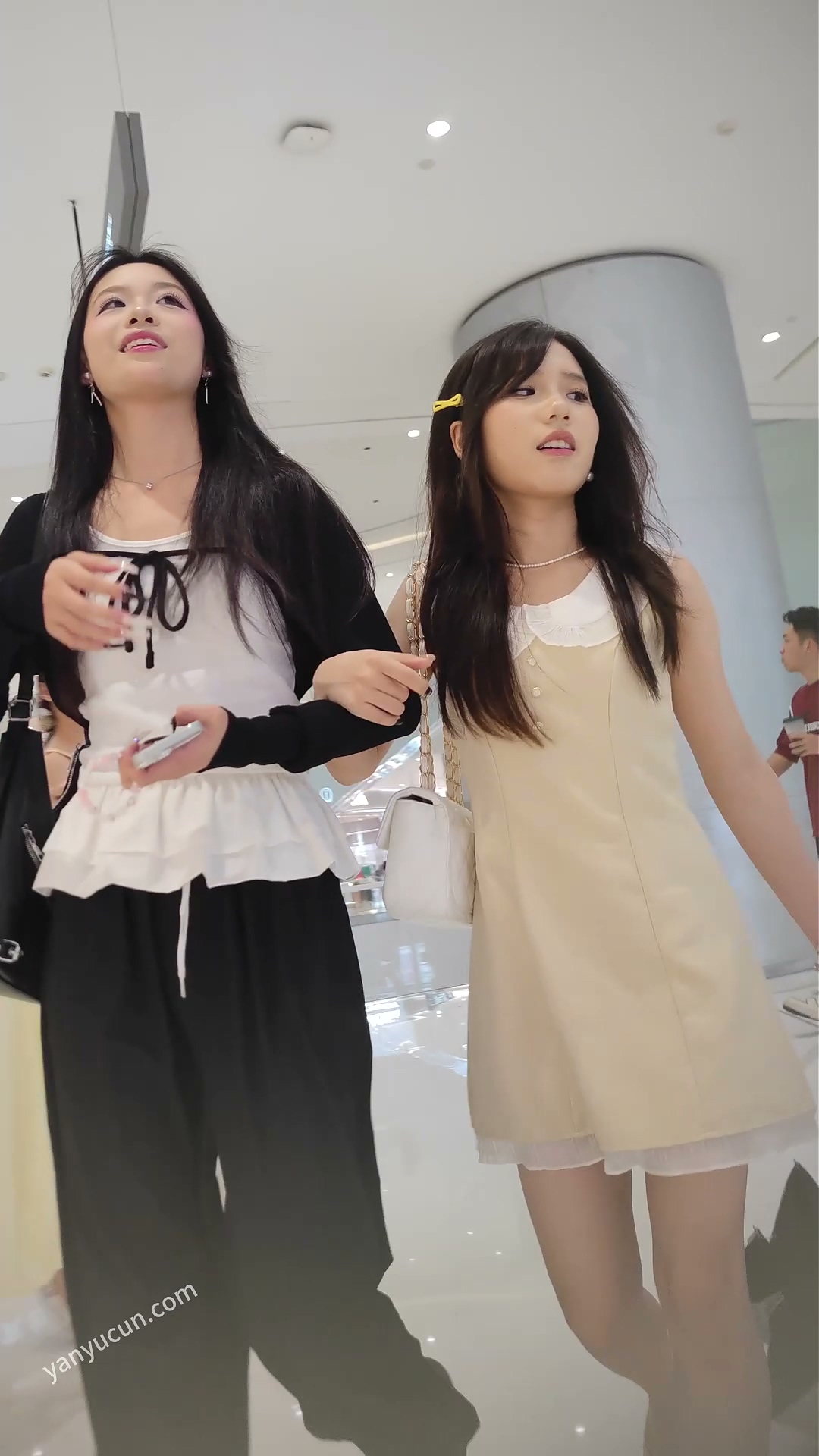 XM500黄色连衣裙高颜值小个子美女和闺蜜逛街,白色内内 ...
