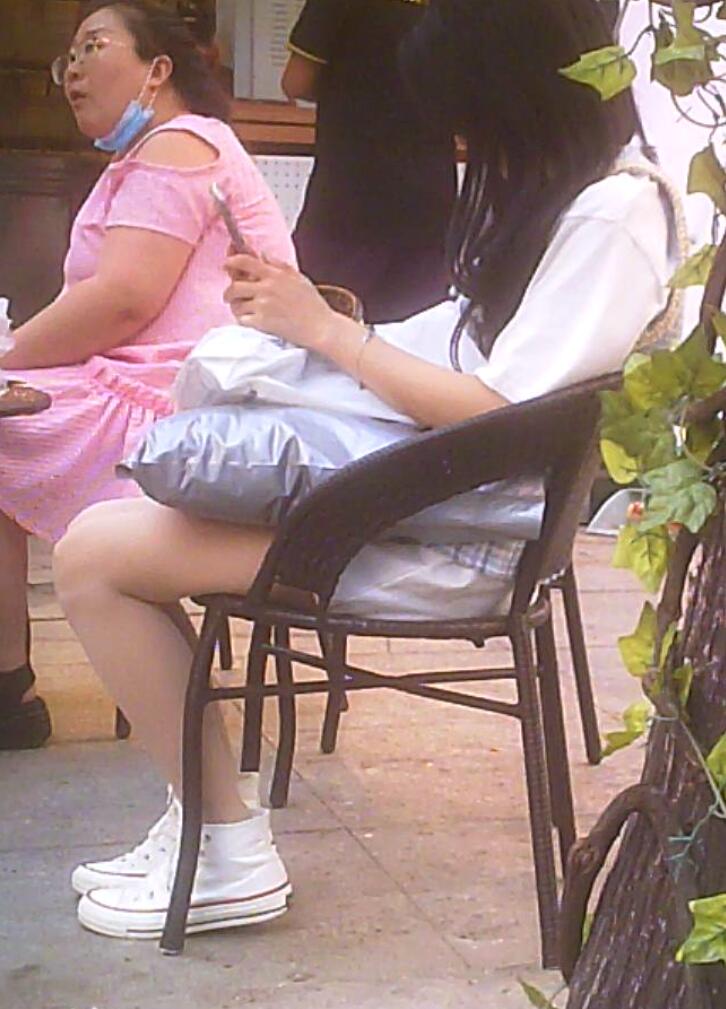 近距离拍摄两个坐着的肉丝美女
