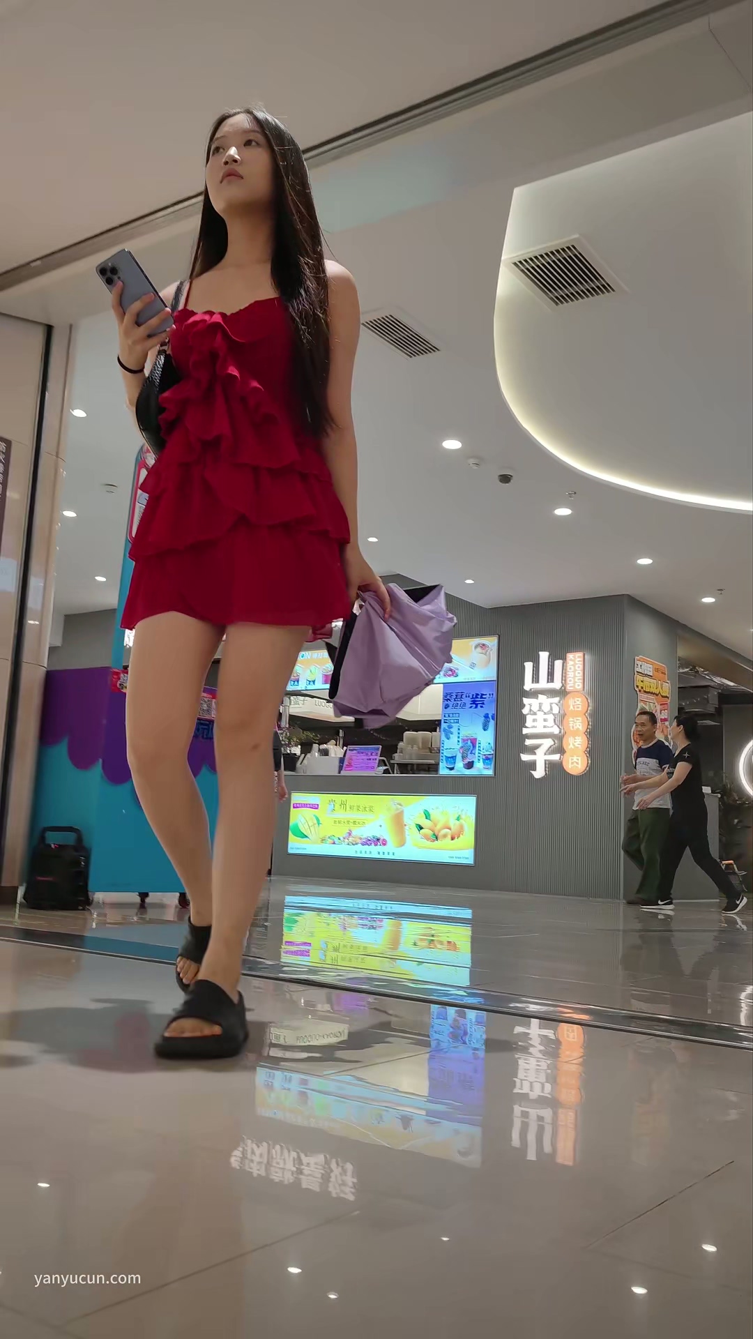 XM335红色蛋糕裙小姐姐一个人逛街,黑色内内 ...