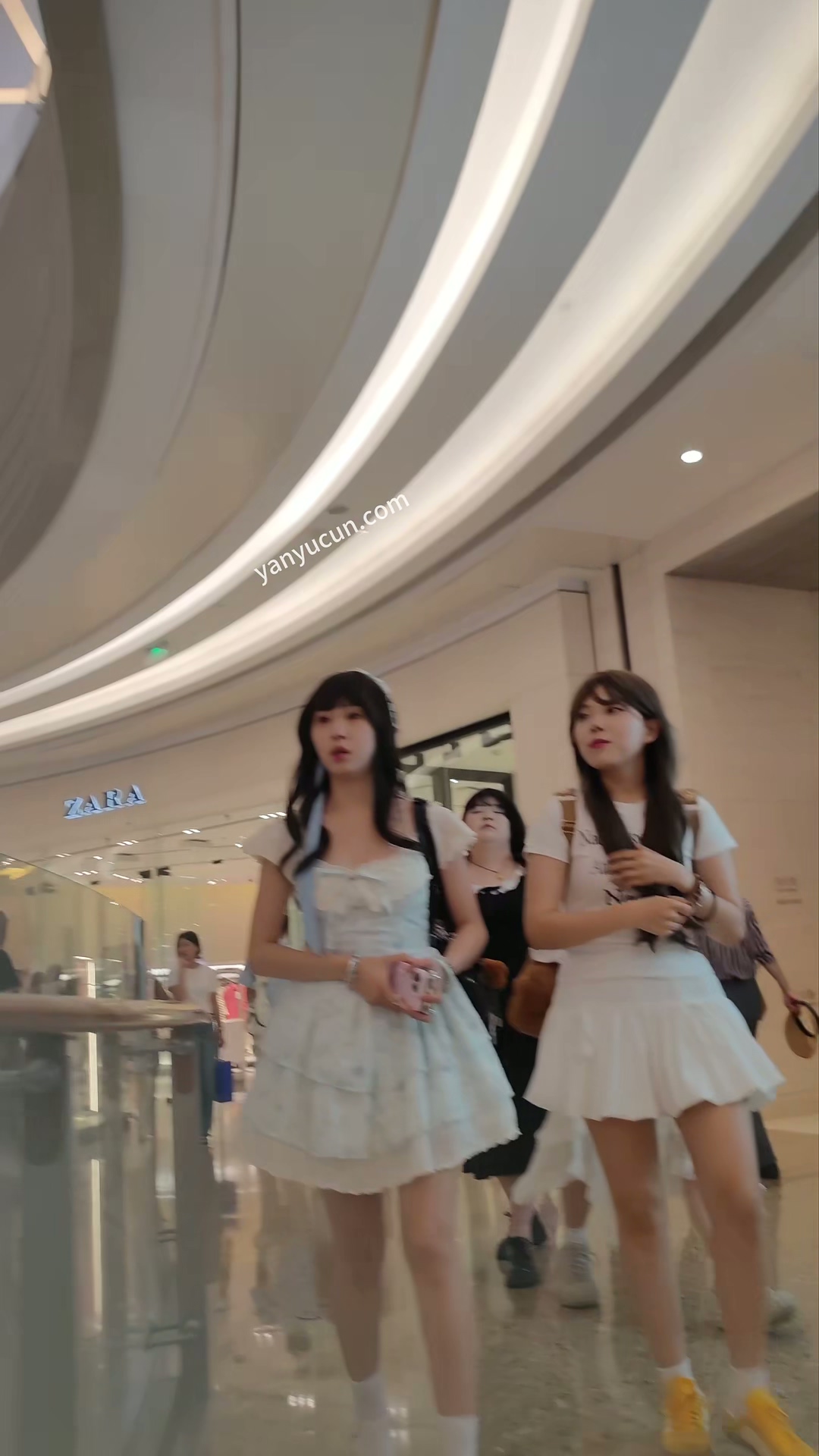 XM401蓝色蛋糕裙小姐姐和闺蜜逛街买衣服,粉色内带翅膀