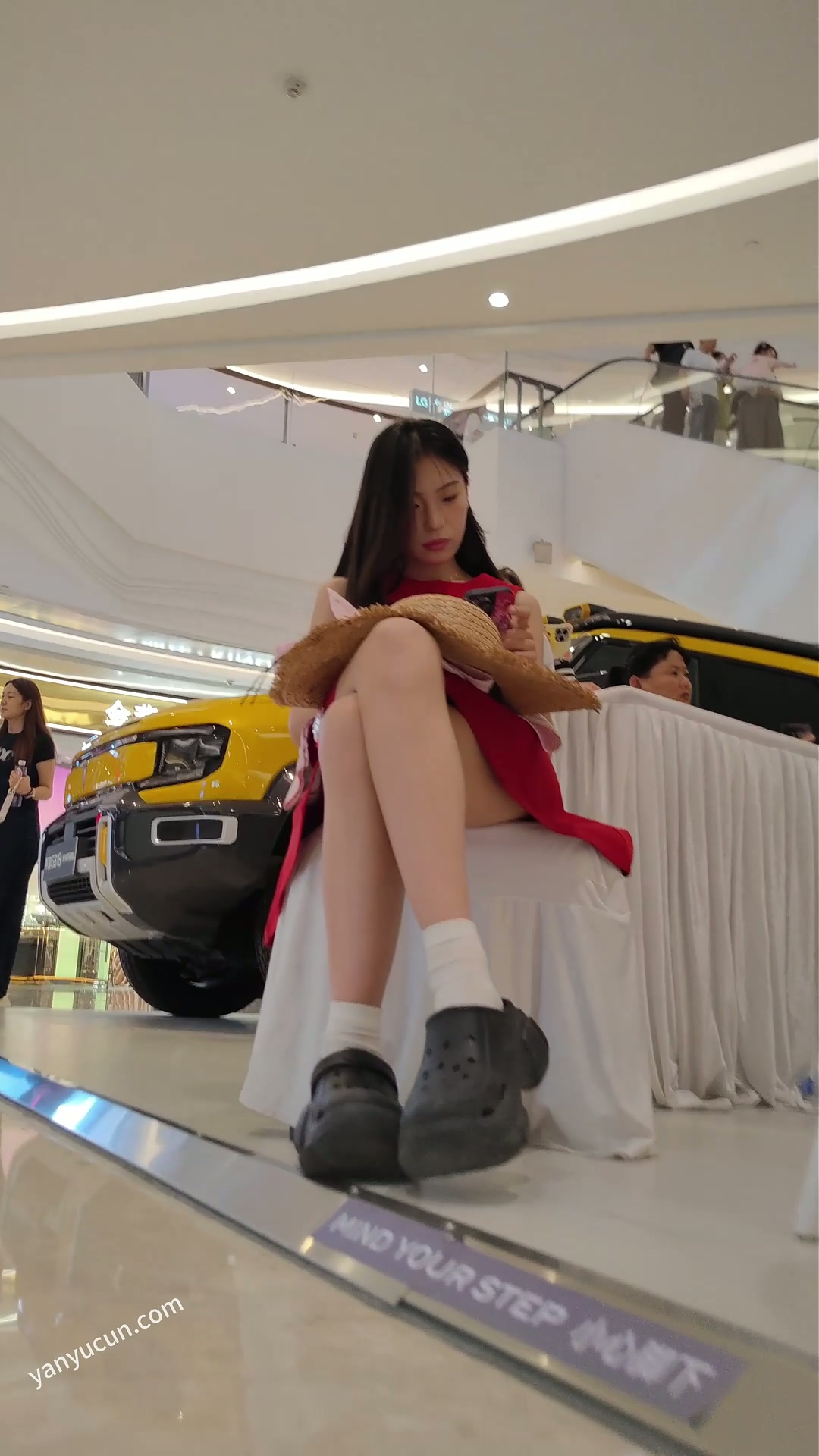 XM429红色连衣裙小姐姐一个人逛街,前后抄底白色内